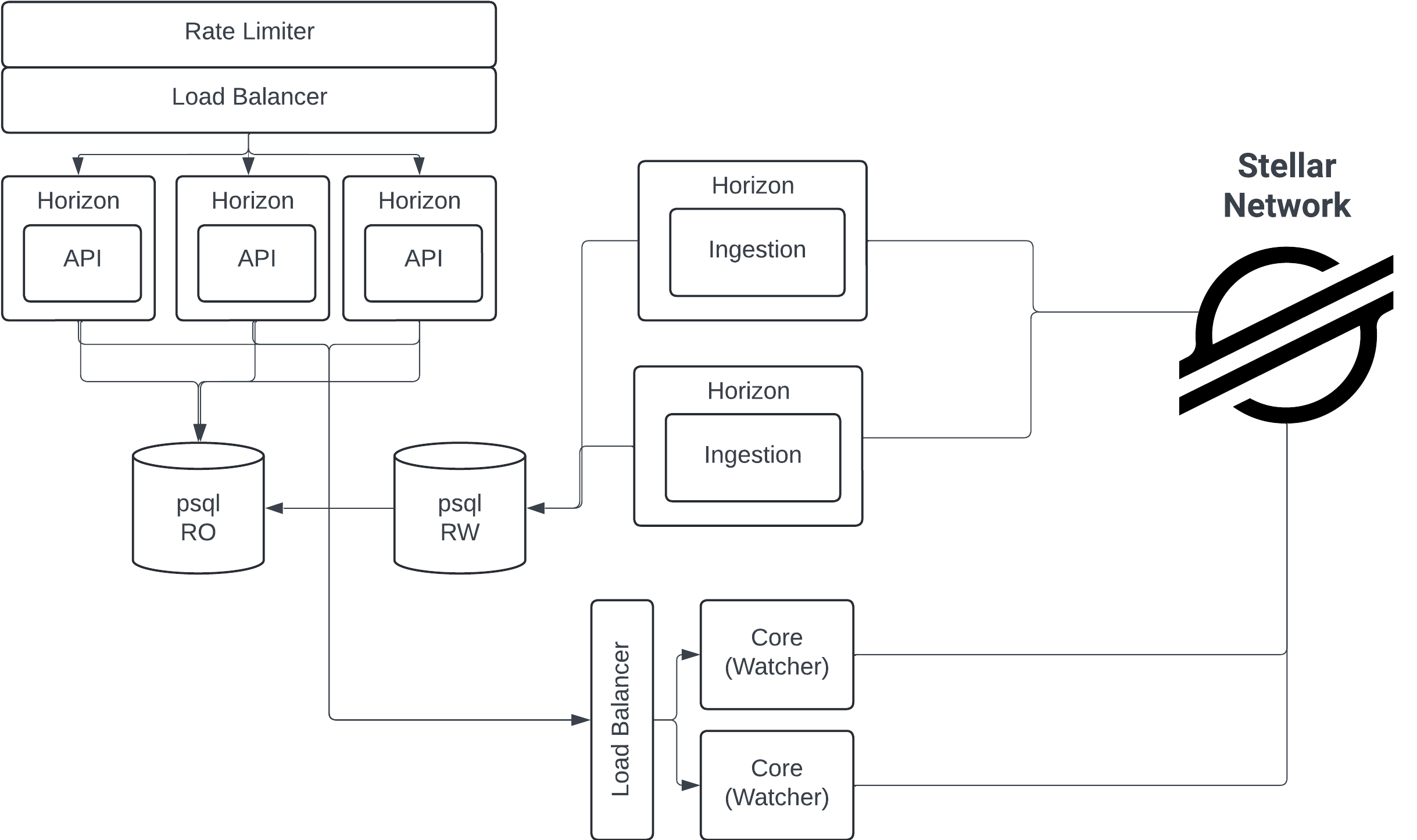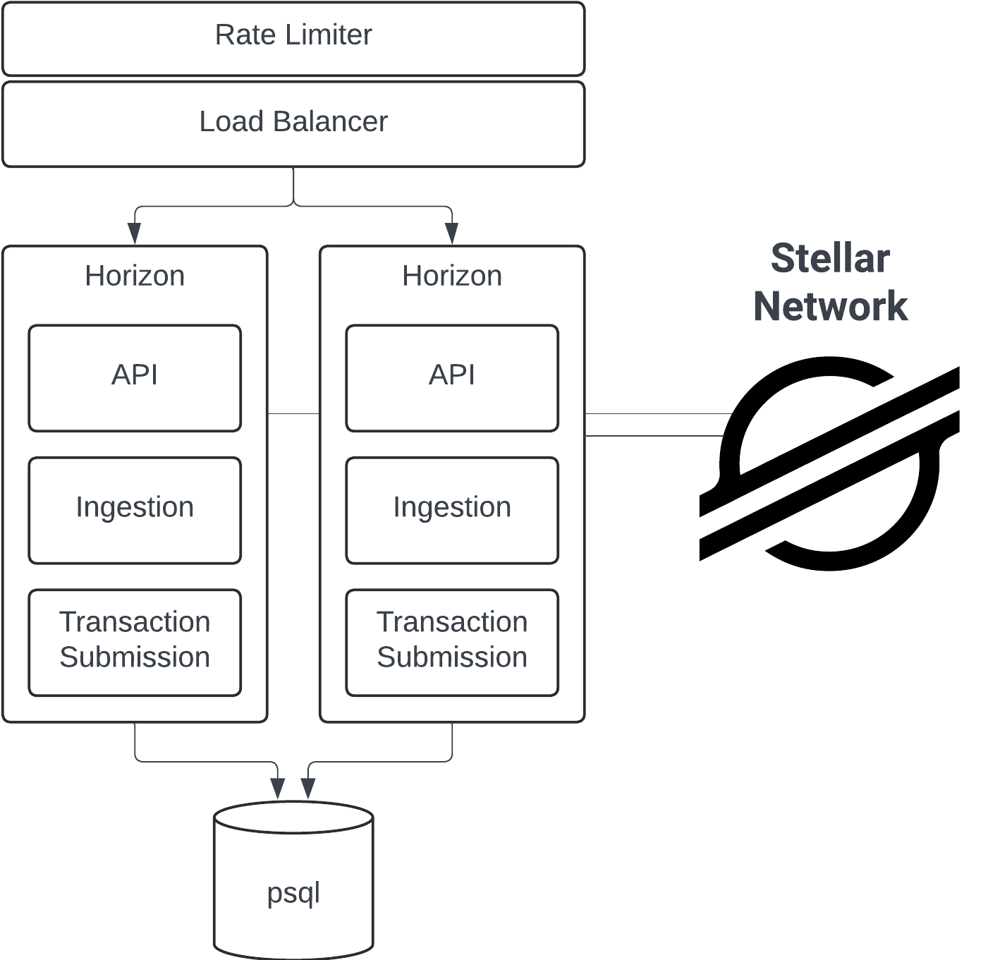 When scaling Horizon, it is worth it to note that Horizon's rate limiting should be disabled and rate limiting should be managed external to Horizon within infrastructure. Horizon's rate limiting implementation is managed in-memory, so does not work with multiple instances.