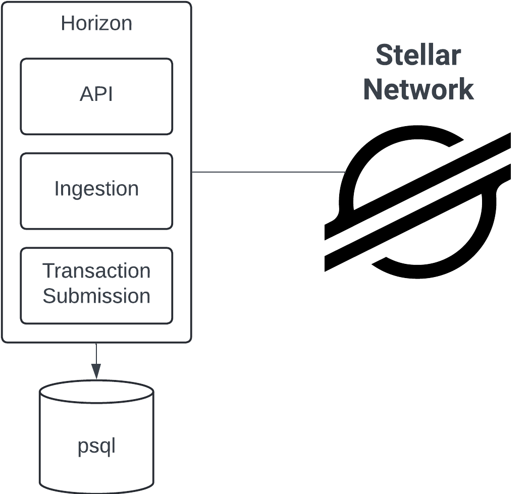 In this setup, a single instance of Horizon performs all three roles; ingestion, transaction submission, and end-user API requests.